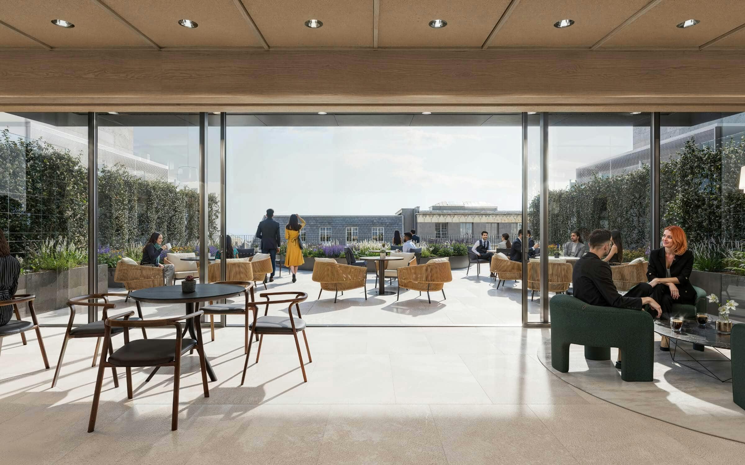 The upper three floors are being reconfigured to provide offices around a light-filled floor-to-roof atrium spaces, with mezzanine levels introduced. A new rooftop terrace and ‘floating’ Sky Room pavilion provide 2,800 sq ft of landscaped socialising and amenity space for occupants and their guests. The ground floor provides a striking, 9m-high, triple-height reception space.