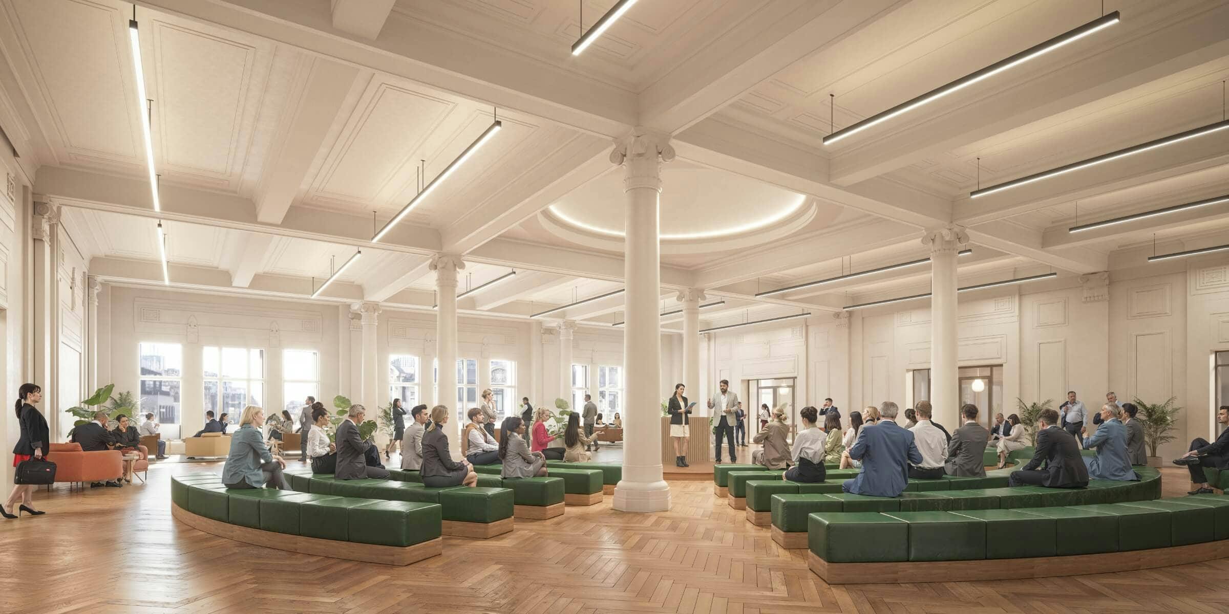 We are overseeing the atrium strip-out and the shell and core fitout of the upper floors, with the design integrating new, contemporary features and modern building services while respecting key elements of the existing structure, such as the domed and feature ceilings. The lifts are being refurbished rather than replaced and key design details are being retained. The scheme uses cross laminated timber slabs and glulam beams to create an attractive diamond pattern across the roof, with the whole space creating a stunning visual effect for those looking up from the ground floor upon entering. The atrium intervention makes use of a new steel frame and cross laminated timber floor slabs to create a lightweight structure that utilizes the existing concrete sub-structure thereby avoiding the need to pour additional concrete foundations, helping to keep its embodied carbon footprint lower.